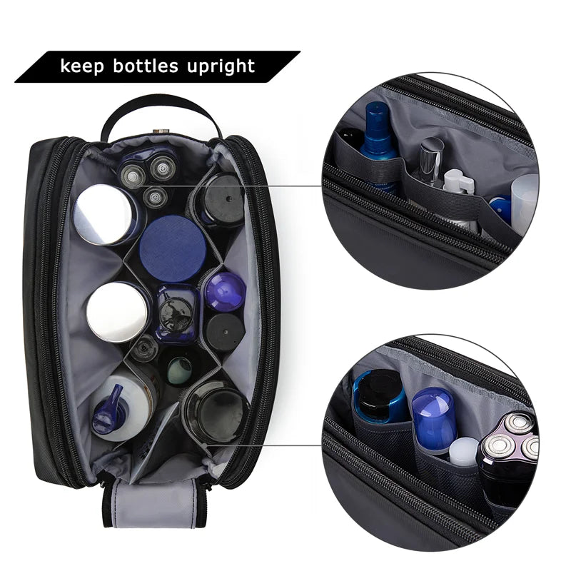 - Large capacity – holds full-size bottles, cosmetics, and shaving kits
